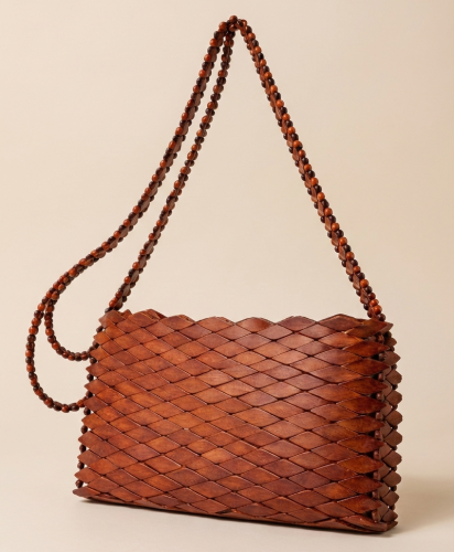Uma bolsa artesanal feita à mão a partir de madeira natural, utilizando técnicas tradicionais de trançado.