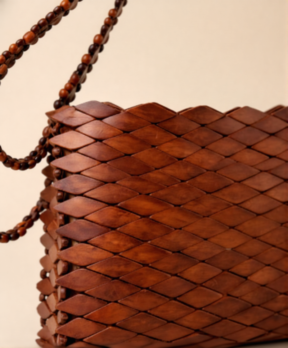 This handmade bag is crafted from natural wood using traditional weaving techniques. Each piece features unique variations, reflecting human craftsmanship and locally sourced materials.